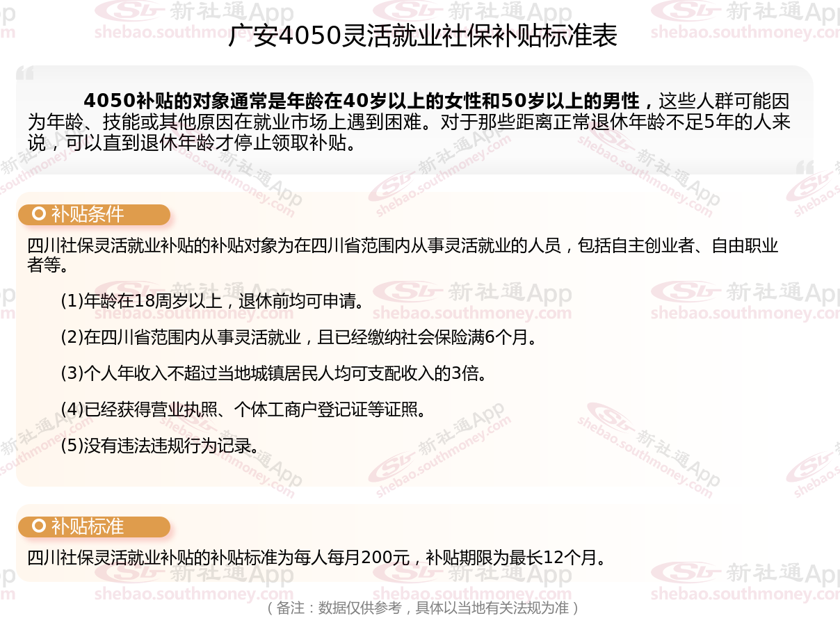一、2025年广安灵活就业4050社保补贴标准及条件是什么(灵活就业4050社保补贴多少钱)
