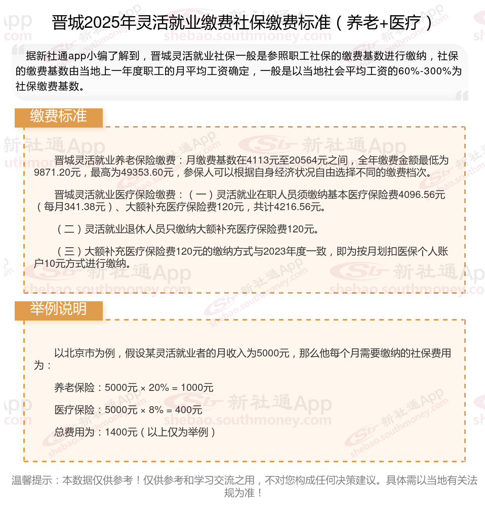 据新社通app数据显示,晋城灵活就业人员养老保险缴费基数2024-2025年最新标准如下: