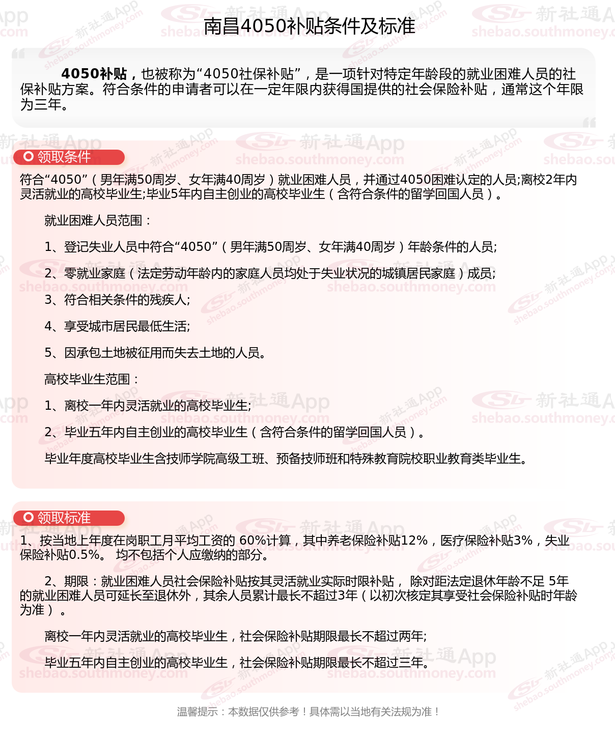 二、2025年南昌4050社保补贴标准及条件,最新如下:
