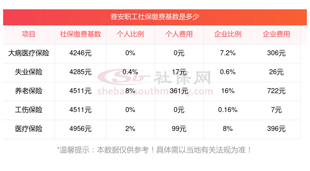 2025年雅安社保缴费最低基数及个人和单位具体是多少钱?下表是2025年雅安社保费用明细参考,新社通app-社保缴费查询工具提供的最新数据如下: