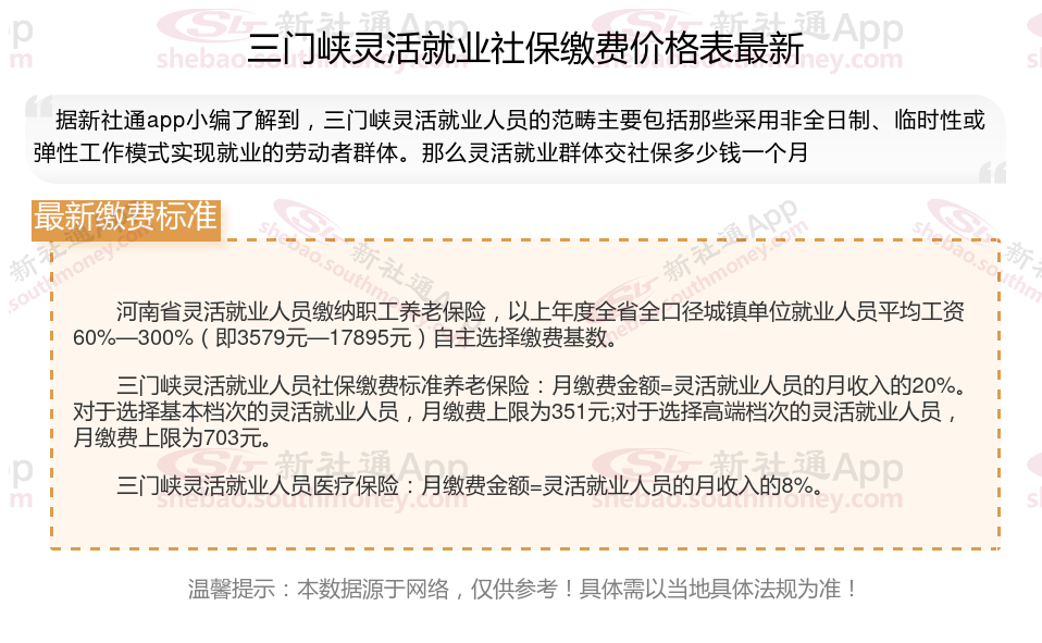 据新社通app数据显示,三门峡灵活就业养老保险的缴费基数为:3579元。灵活就业人员参保缴费的比例为个人20%。