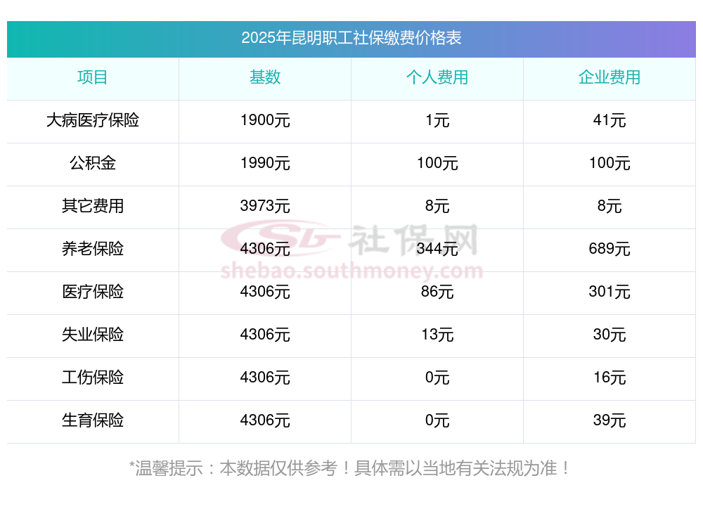 2025年昆明社保缴费价格,2025年昆明社保缴费多少钱?下表是2025年昆明社保费用明细参考,新社通app-社保缴费查询工具提供的最新数据如下: