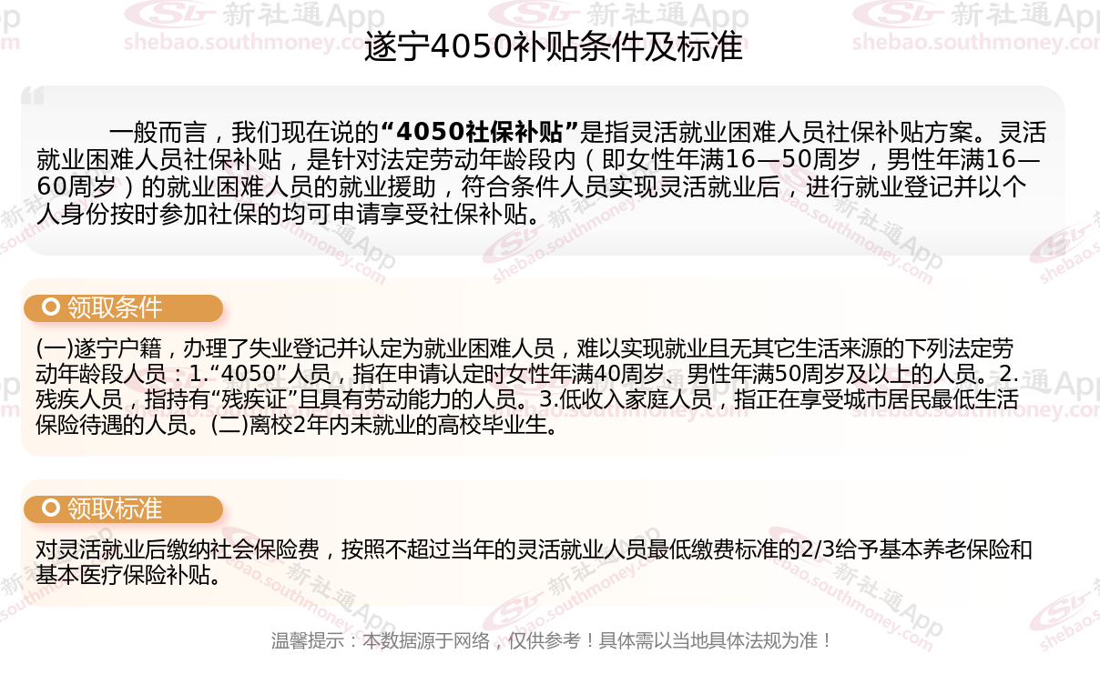 二、遂宁4050社保补贴标准及条件2025年,最新如下
