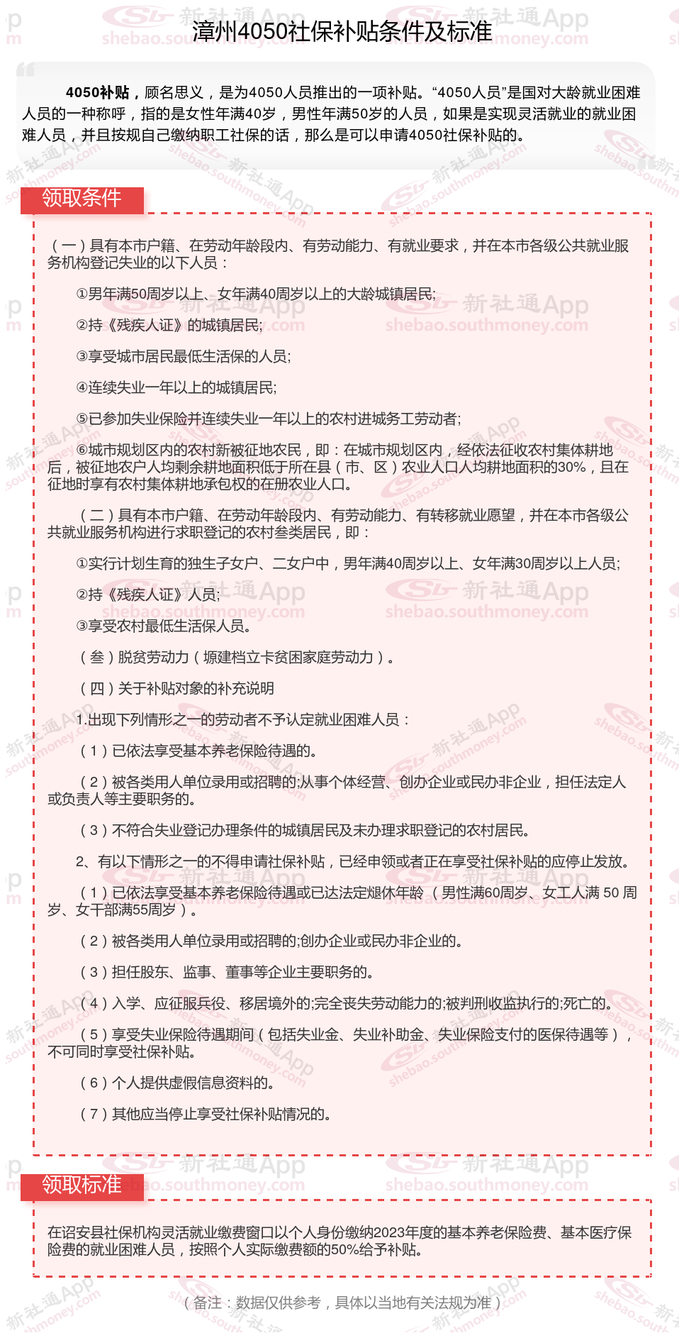 4050补贴主要是针对大龄就业困难人群的社保补贴,申请条件包括年龄、就业困难、灵活就业并自费缴纳社保,需要持有失业登记证,不同地区可能有细微差别,比如农村户口的限制。那么漳州4050灵活就业社保补贴标准是多少钱?漳州4050社保补贴条件是什么?接下来随新社通APP小编了解一下最新资讯。