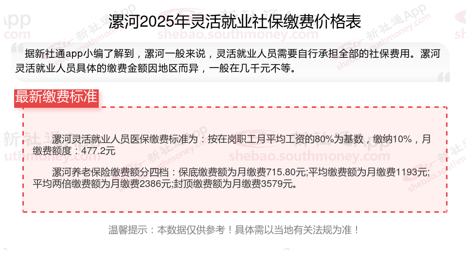 据新社通app数据显示,漯河灵活就业养老缴费基数明细如下: