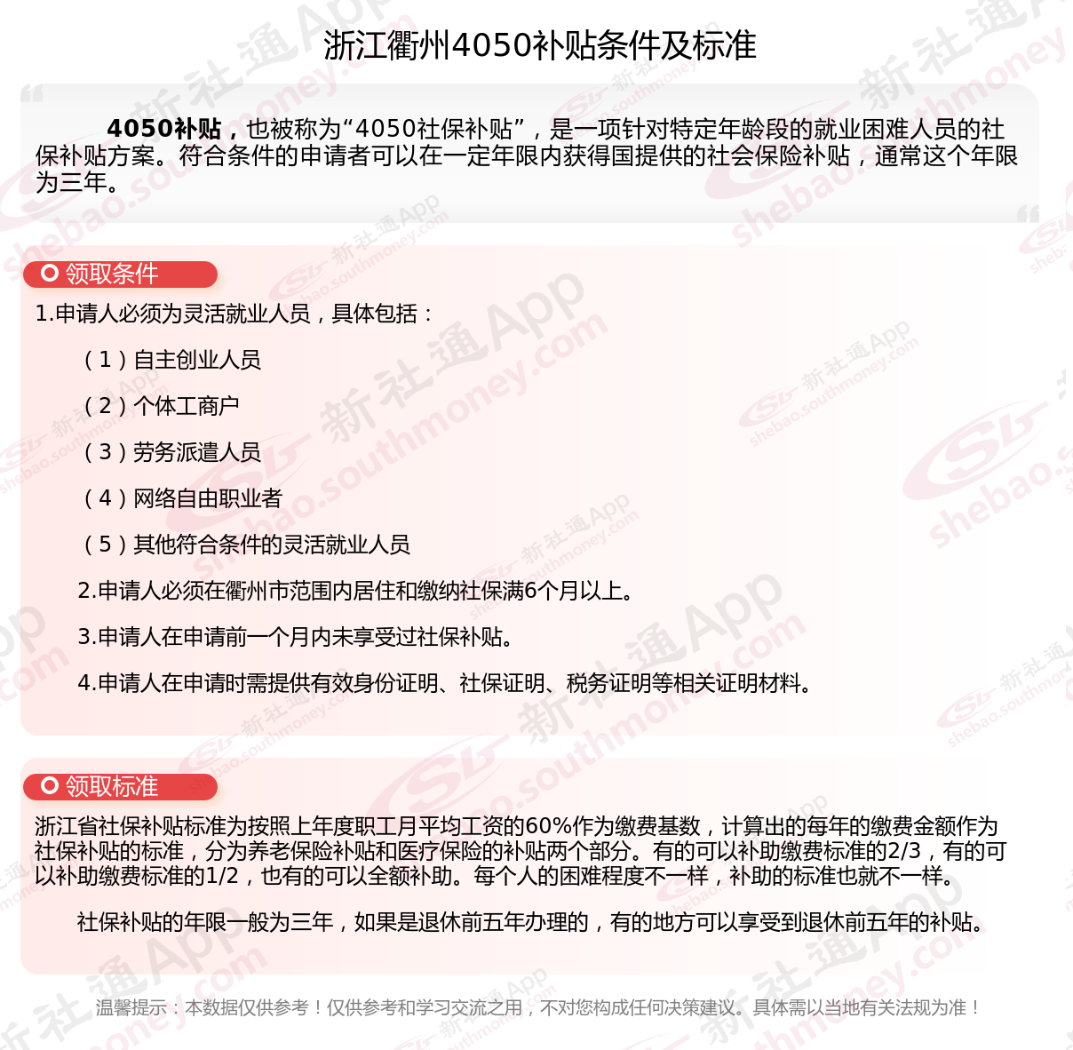 二、浙江衢州4050社保补贴标准及条件2025年最新消息