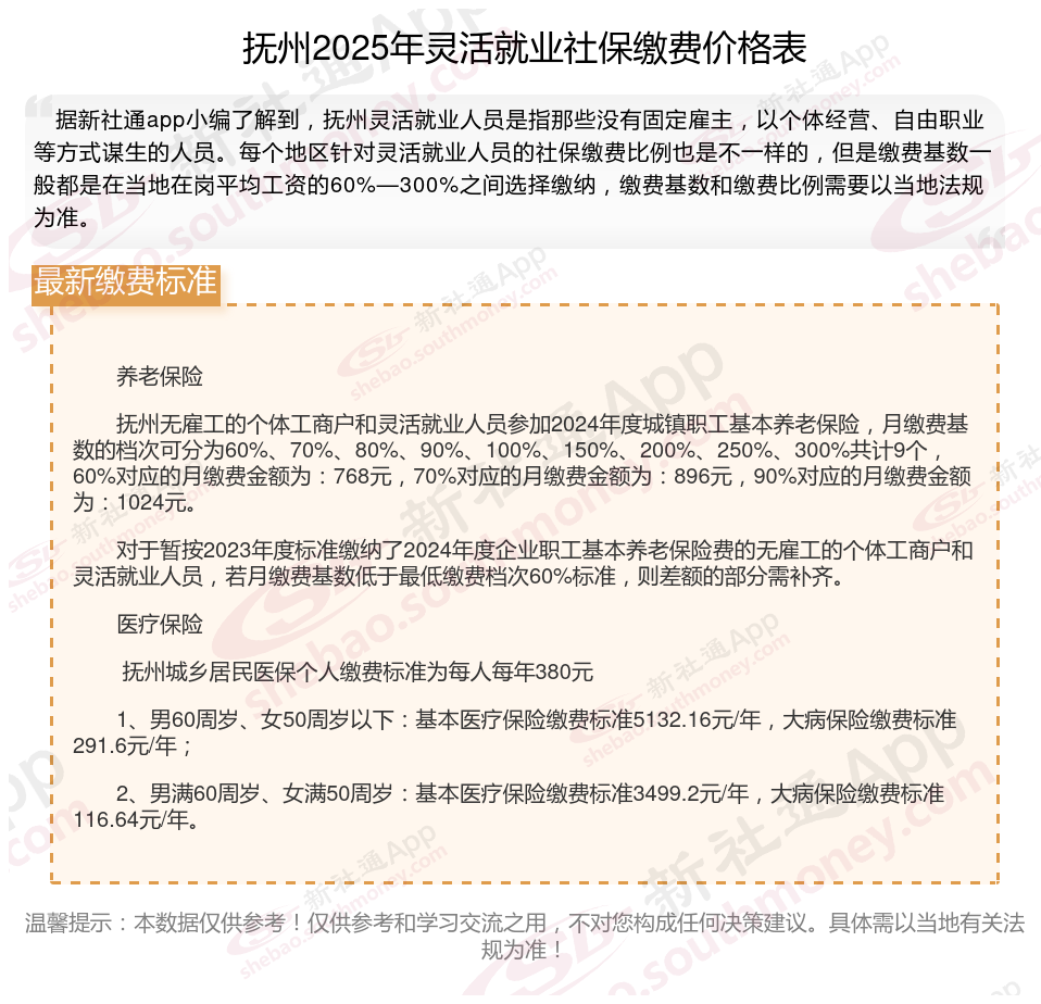 据新社通app数据显示,抚州灵活就业养老保险缴费基数2024-2025年最新标准如下: