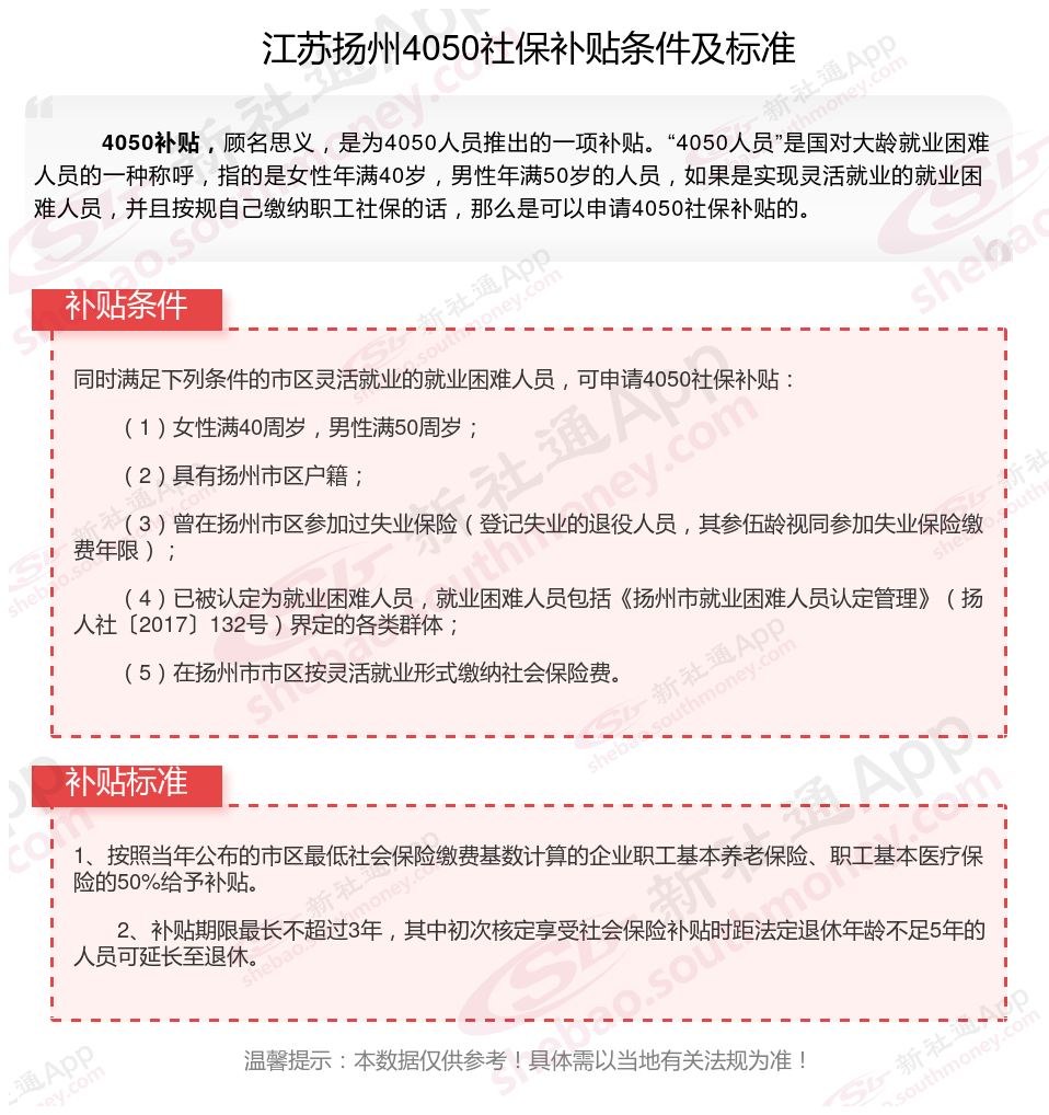 今天聊一下4050补贴的相关内容。4050补贴听起来像是一个针对特定年龄人群的社保补贴。比如女性需年满40周岁,男性需年满50周岁(以申请当年12月31日为截止日期)。那么江苏扬州4050灵活就业困难人员社保补贴多少钱?江苏扬州4050社保补贴可以申请吗?接下来随新社通APP小编具体了解一下4050社保补贴内容。