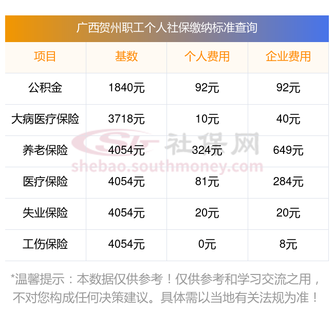 广西贺州五险一金交多少钱一个月?和新社通-app小编一起来看看2024-2025年广西贺州最低社保费用明细参考,新社通app-社保缴费查询工具提供的最新数据如下: