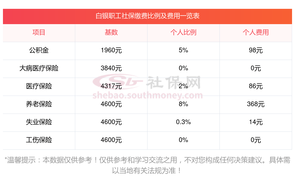 2025年白银社保缴费多少钱?下表是2023-2024年白银社保费用明细参考,新社通app-社保缴费查询工具提供的最新数据如下:
