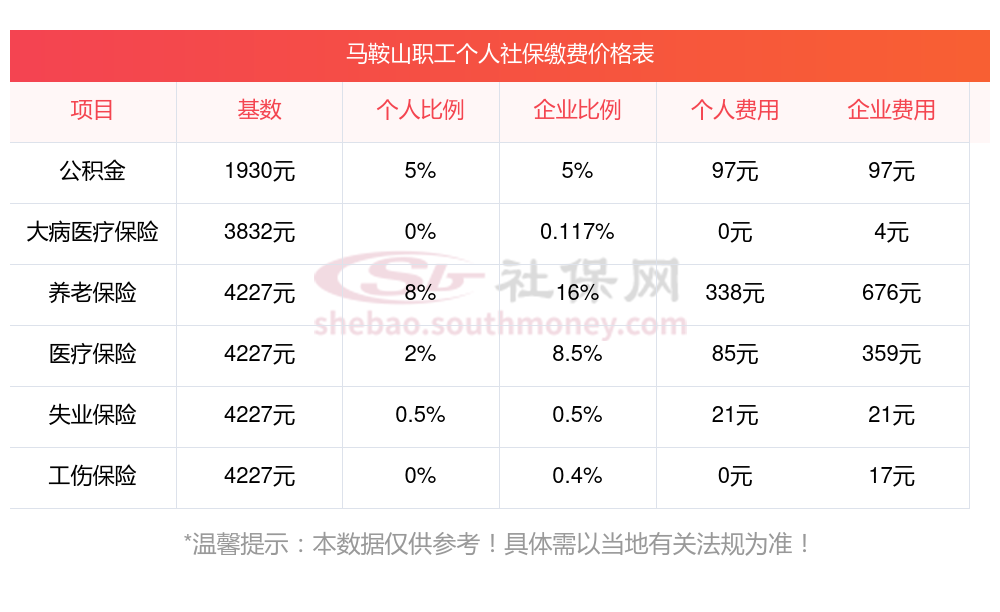马鞍山2025年社保缴费个人和公司各承担多少?马鞍山五险一金每月最低交多少?下表是2025年马鞍山社保费用明细参考,新社通app-社保缴费查询工具提供的最新数据如下: