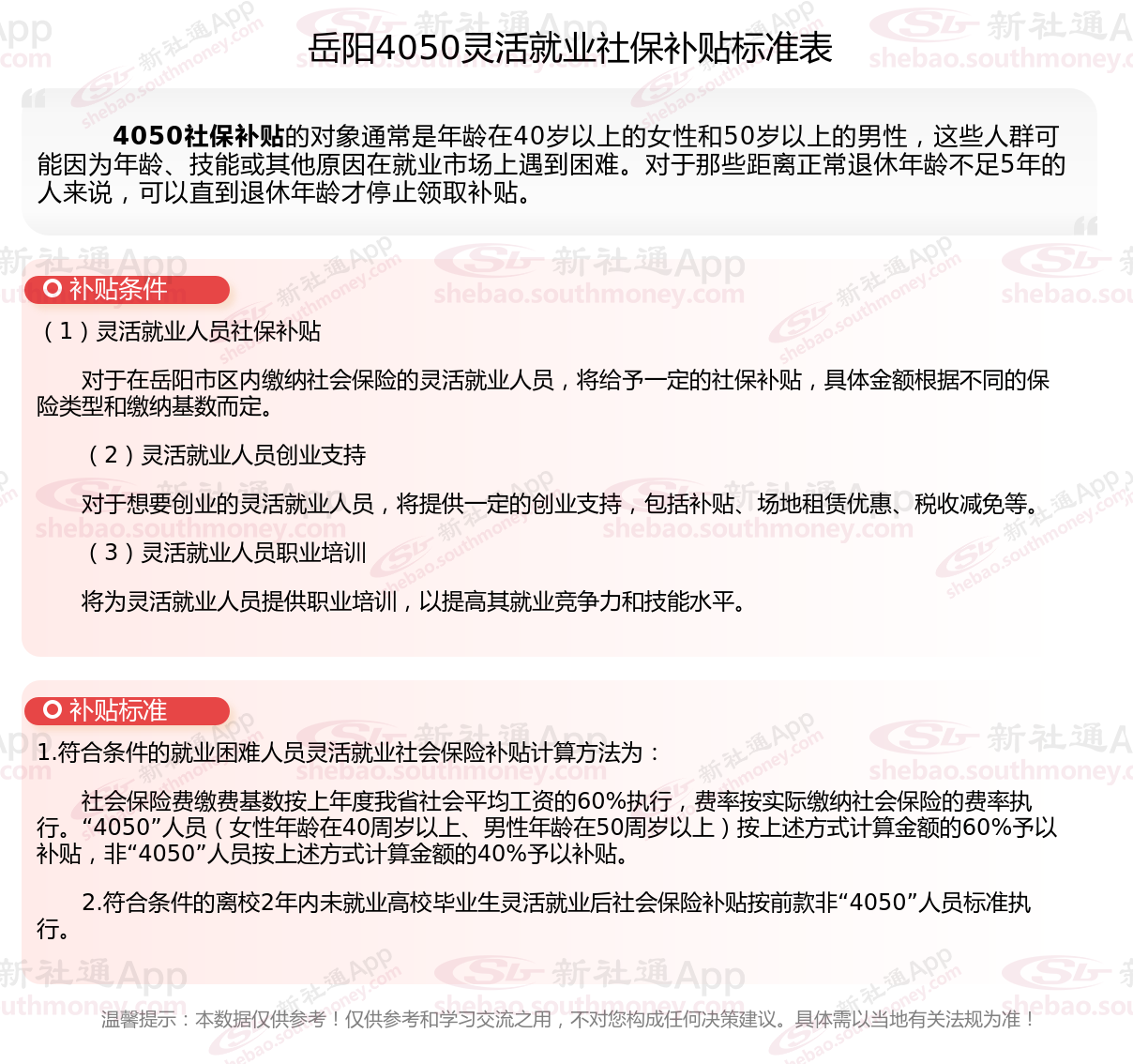 二、2025年岳阳4050社保补贴标准及条件,最新如下: