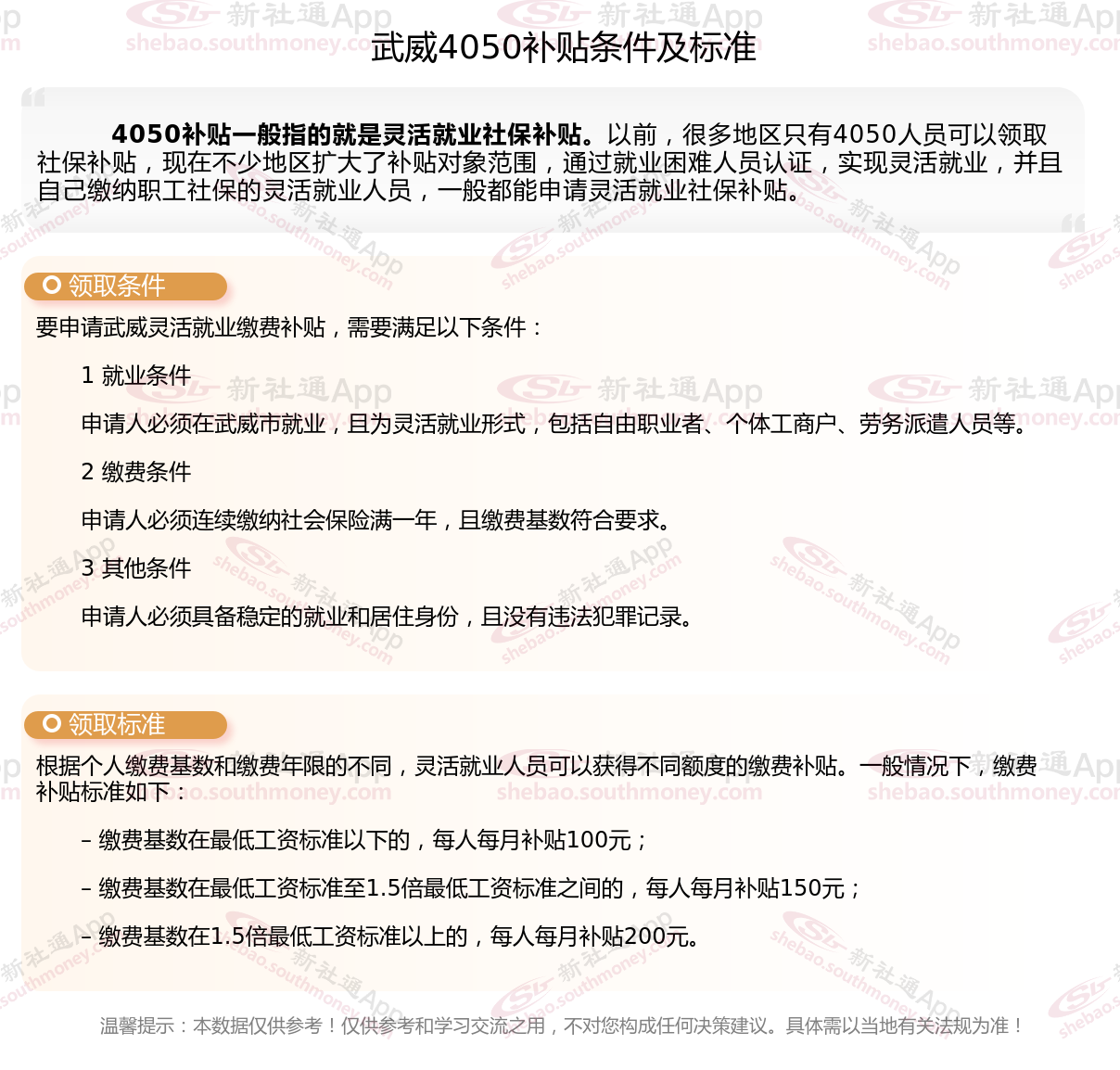 武威4050灵活就业社保补贴是什么?今天聊一下4050补贴话题。4050补贴听起来像是一个针对特定年龄人群的社保补贴。比如女性需年满40周岁,男性需年满50周岁(以申请当年12月31日为截止日期)。那么武威4050灵活就业社保补贴标准是多少钱?武威4050社保补贴可以领取多少?接下来随新社通APP小编了解一下武威4050灵活就业社保补贴的最新资讯。