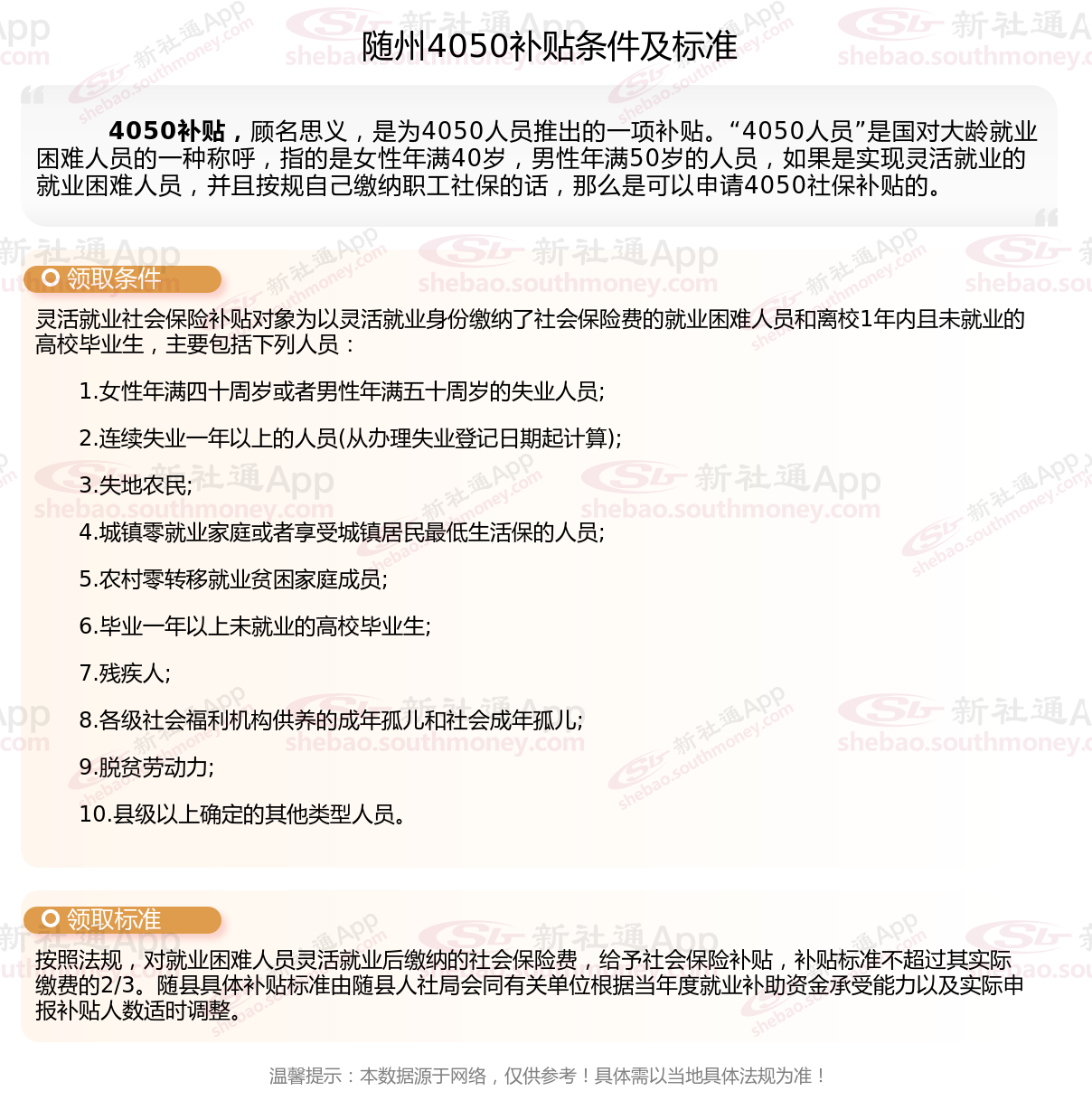 随州4050灵活就业社保补贴是什么?今天聊一下4050补贴话题。4050补贴听起来像是一个针对特定年龄人群的社保补贴。比如女性需年满40周岁,男性需年满50周岁(以申请当年12月31日为截止日期)。那么随州4050灵活就业社保补贴标准是多少钱?随州4050社保补贴可以领取多少?接下来随新社通APP小编了解一下随州4050灵活就业社保补贴的最新资讯。