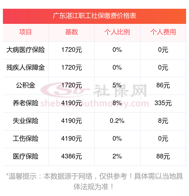 2025年广东湛江社保缴费多少钱?下表是2023-2024年广东湛江社保费用明细参考,新社通app-社保缴费查询工具提供的最新数据如下: