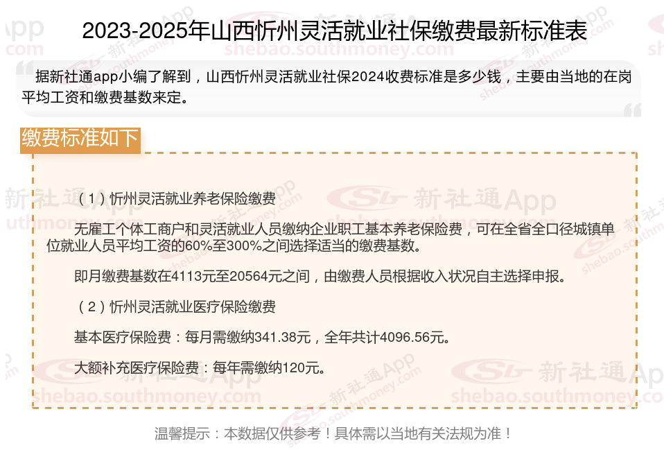 据新社通app数据显示,山西忻州灵活就业养老保险缴费基数2024-2025年最新标准如下: