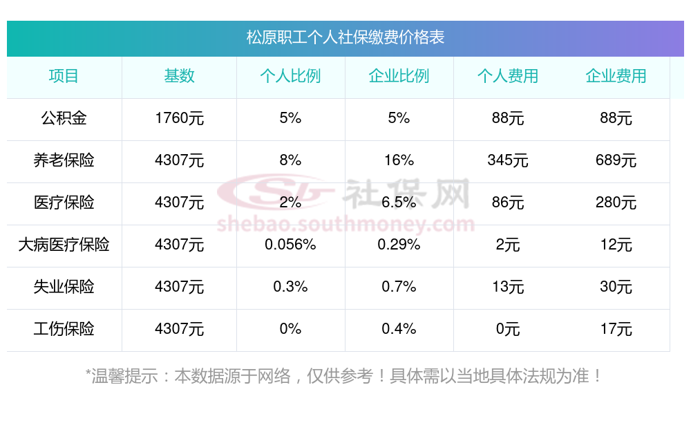 松原2025年社保缴费个人和公司各承担多少?松原五险一金每月最低交多少?下表是2025年松原社保费用明细参考,新社通app-社保缴费查询工具提供的最新数据如下: