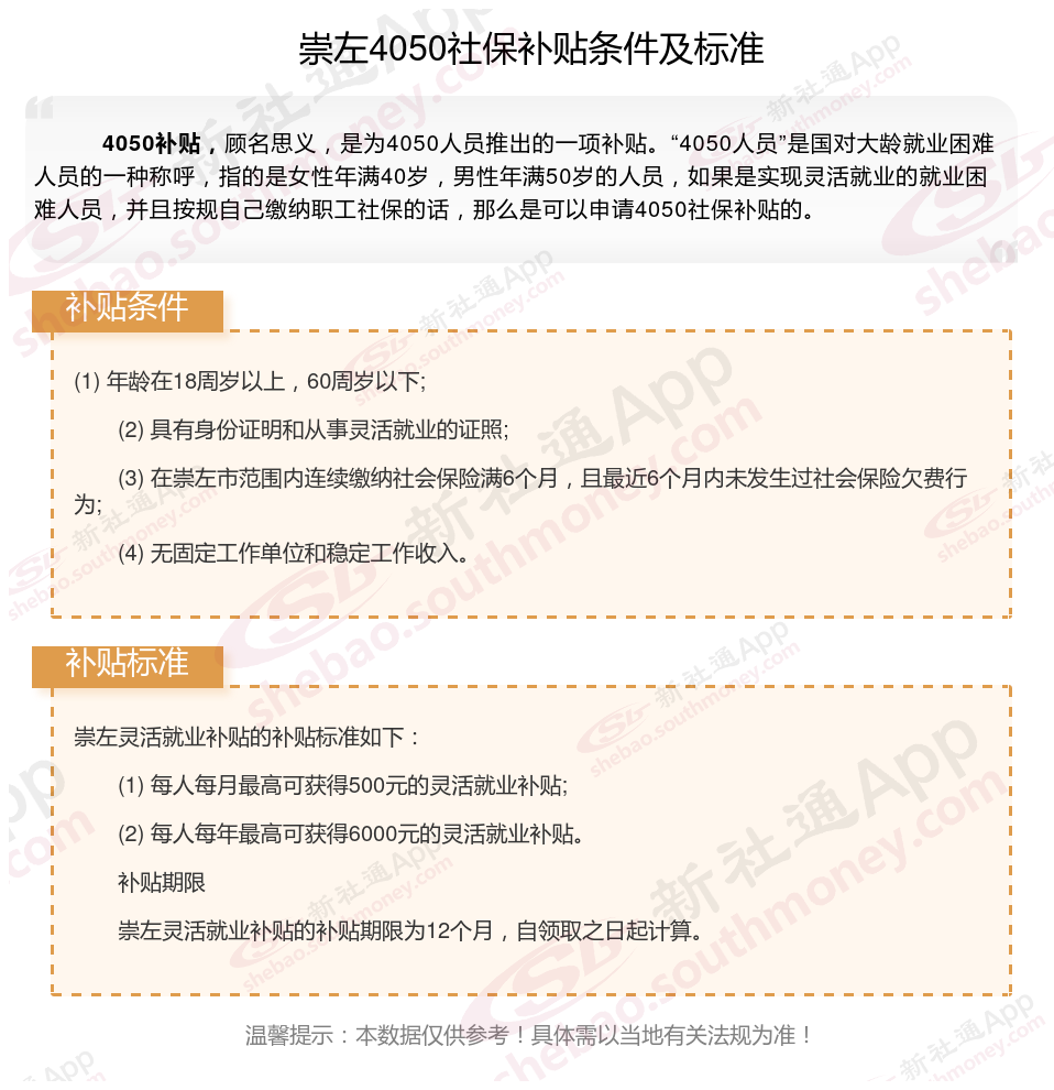 二、2025年崇左4050社保补贴标准及条件,最新如下: