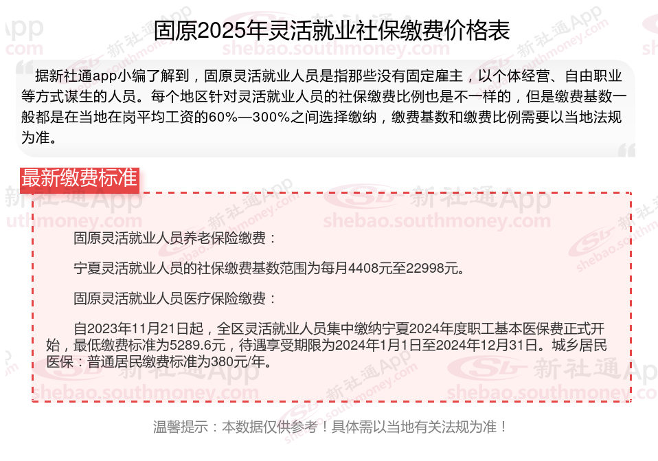 2025灵活就业社保缴费标准的调整,既体现了法规的连续性,又适应了经济社会发展的要求。灵活就业人员应根据自身情况,合理选择缴费基数和缴费比例,确保自身权益得到充分保证。那么2025年固原灵活就业人员社保需要交多少钱?下面随新社通小编一起来看看。