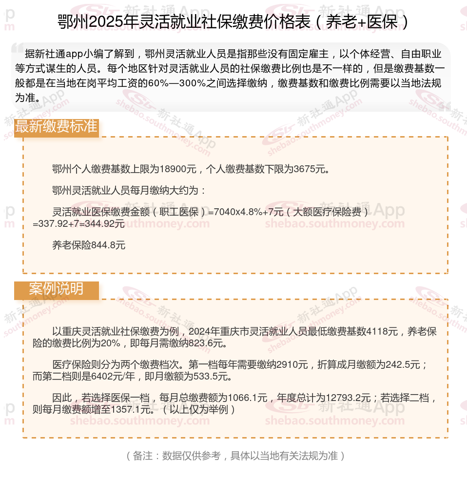 据新社通app数据显示,鄂州灵活就业养老保险缴费基数2024-2025年最新标准如下: