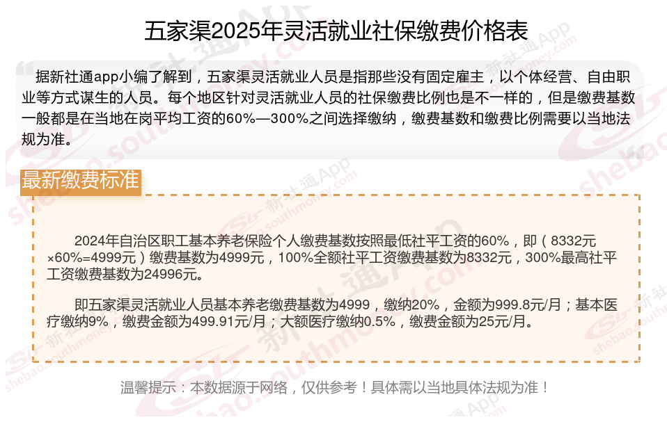 据新社通app数据显示,五家渠企业灵活就业养老保险的缴费基数为:4999元。