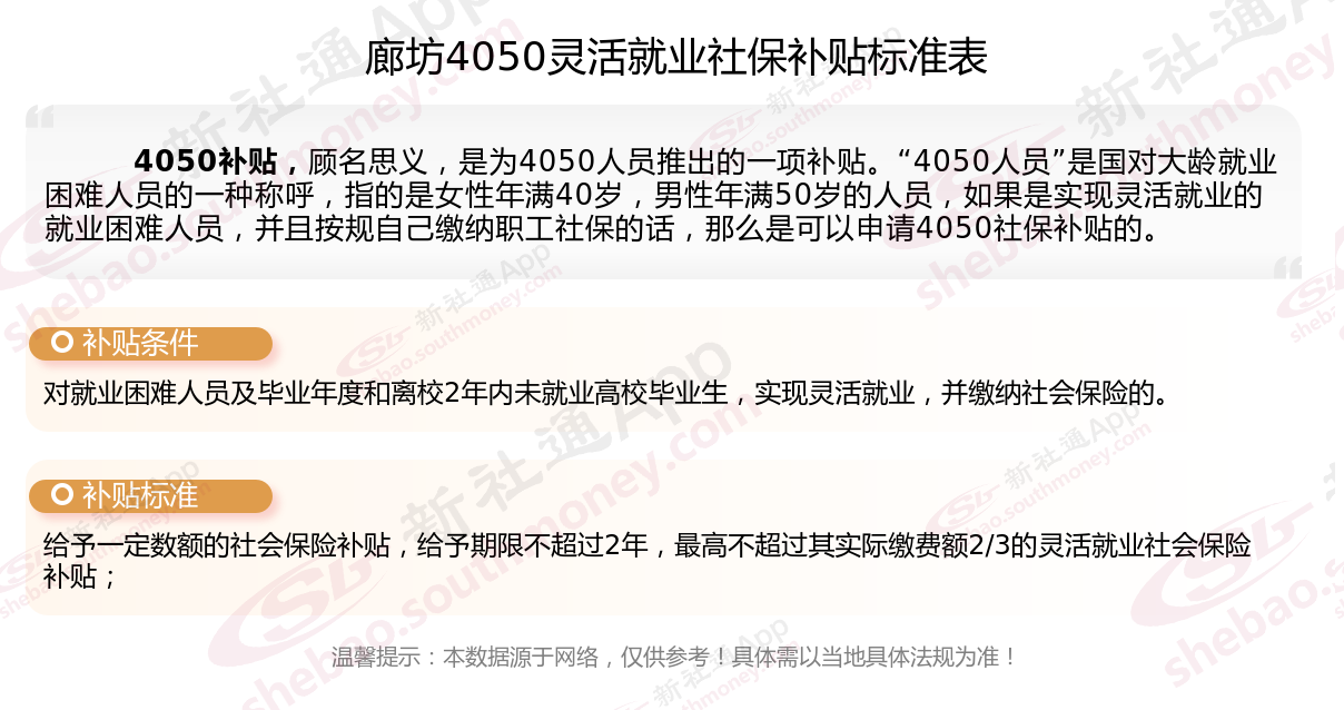 一、2025年廊坊灵活就业4050社保补贴标准及条件是什么