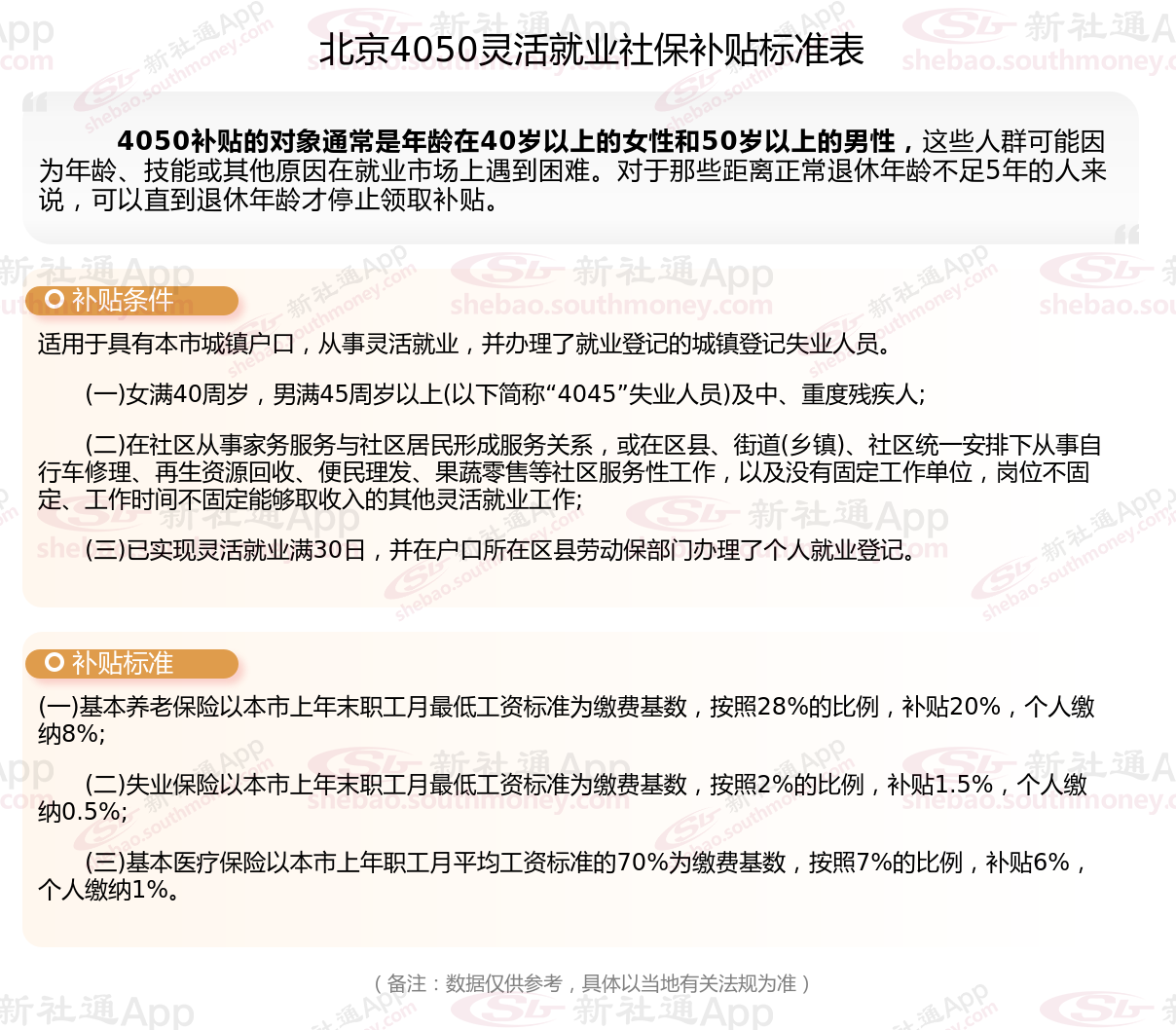 今天聊一下4050补贴的相关内容。4050补贴听起来像是一个针对特定年龄人群的社保补贴。比如女性需年满40周岁,男性需年满50周岁(以申请当年12月31日为截止日期)。那么北京4050灵活就业困难人员社保补贴多少钱?北京4050社保补贴可以申请吗?接下来随新社通APP小编具体了解一下4050社保补贴内容。