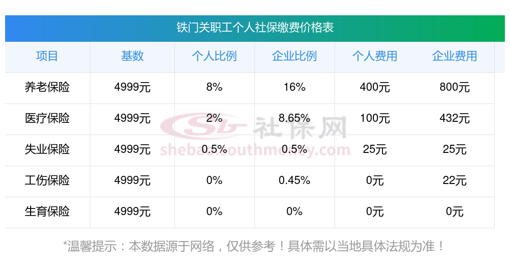 新疆社保多少钱一个月?下表是2024-2025年铁门关社保费用明细参考,新社通app-社保缴费查询工具提供的最新数据如下: