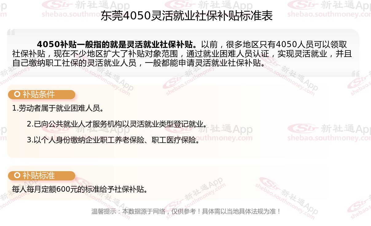 今天聊一下4050补贴话题。4050补贴听起来像是一个针对特定年龄人群的社保补贴。比如女性需年满40周岁,男性需年满50周岁(以申请当年12月31日为截止日期)。那么东莞4050灵活就业社保补贴标准是多少钱?东莞4050社保补贴条件是什么?接下来随新社通APP小编了解一下最新资讯。