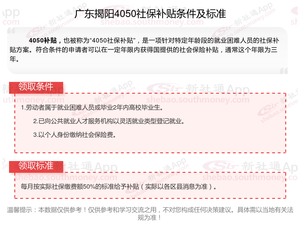 今天聊一下4050补贴话题。4050补贴听起来像是一个针对特定年龄人群的社保补贴。比如女性需年满40周岁,男性需年满50周岁(以申请当年12月31日为截止日期)。那么广东揭阳4050灵活就业社保补贴标准是多少钱?广东揭阳4050社保补贴条件是什么?接下来随新社通APP小编了解一下最新资讯。