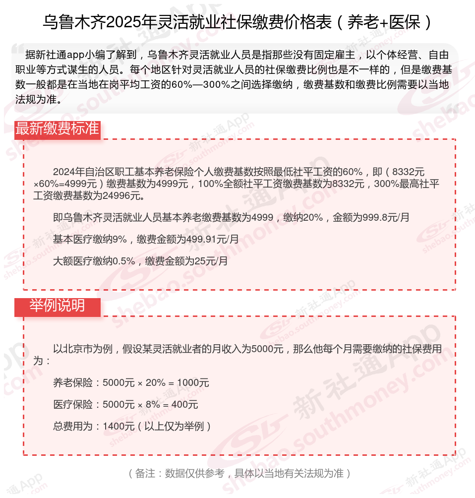 即乌鲁木齐灵活就业人员基本养老缴费基数为4999,缴纳20%,金额为999.8元/月