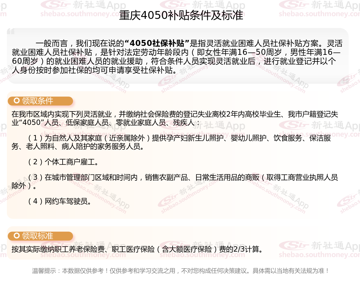 一、最新重庆4050社保补贴标准及条件