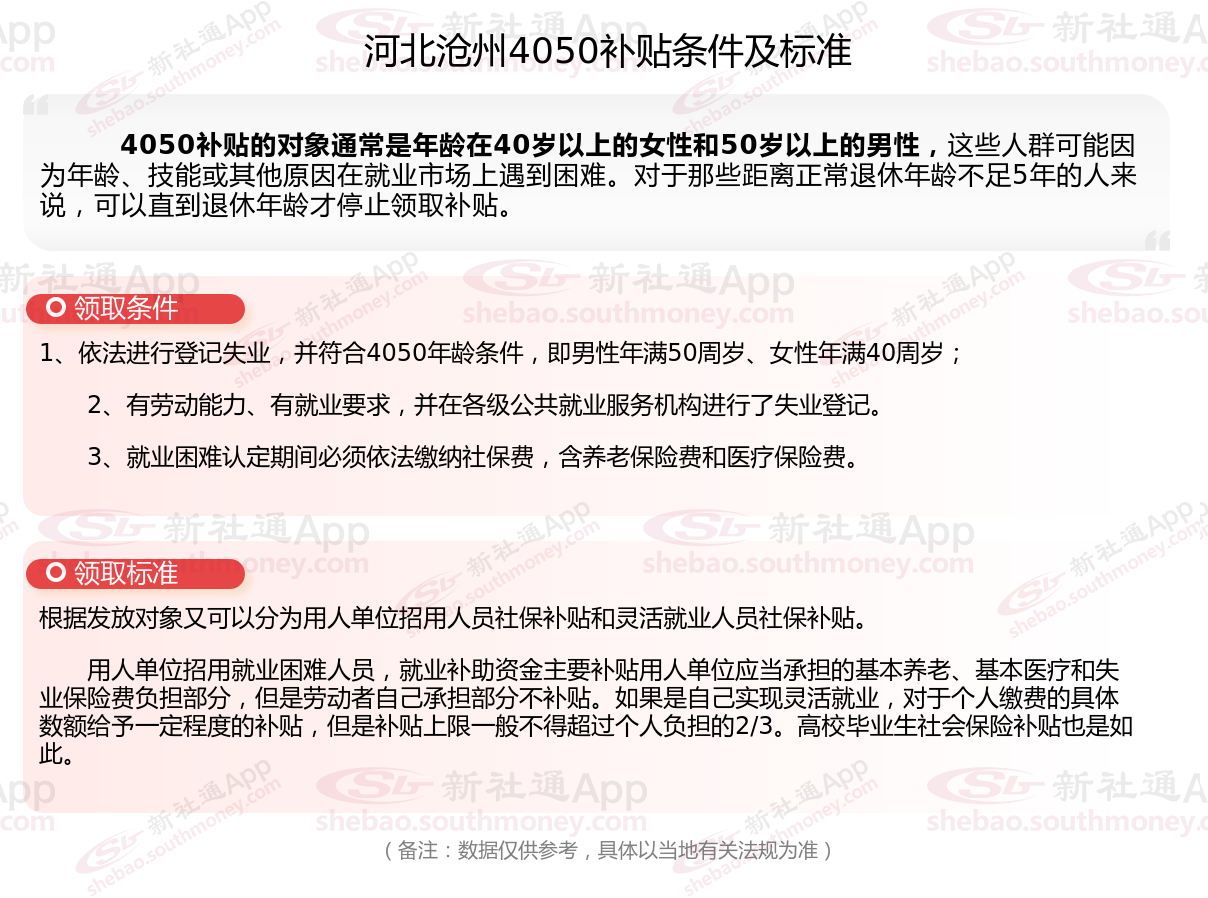 4050补贴主要是针对大龄就业困难人群的社保补贴,申请条件包括年龄、就业困难、灵活就业并自费缴纳社保,需要持有失业登记证,不同地区可能有细微差别,比如农村户口的限制。那么河北沧州4050灵活就业社保补贴标准是多少钱?河北沧州4050社保补贴条件是什么?接下来随新社通APP小编了解一下最新资讯。
