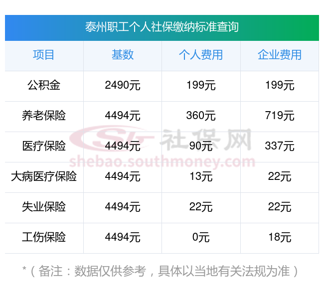 2025年泰州社保缴费最低基数及个人和单位具体是多少钱?下表是2025年泰州社保费用明细参考,新社通app-社保缴费查询工具提供的最新数据如下: