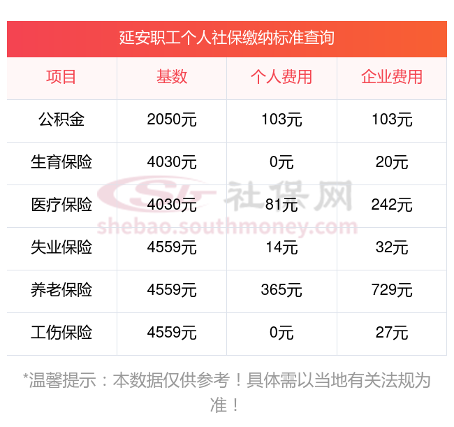 2025年延安社保缴费多少钱?下表是2024-2025年延安社保费用明细参考,新社通app-社保缴费查询工具提供的最新数据如下: