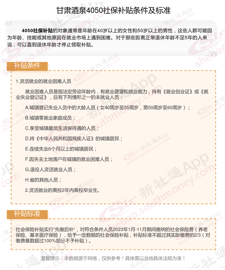 二、甘肃酒泉灵活就业4050社保补贴标准2025年(4050社保条件是什么)