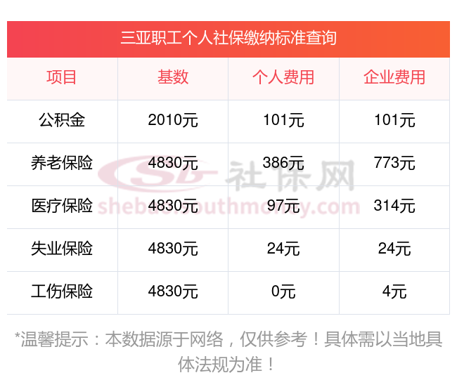 2025年三亚社保缴费多少钱?下表是2024-2025年三亚社保费用明细参考,新社通app-社保缴费查询工具提供的最新数据如下: