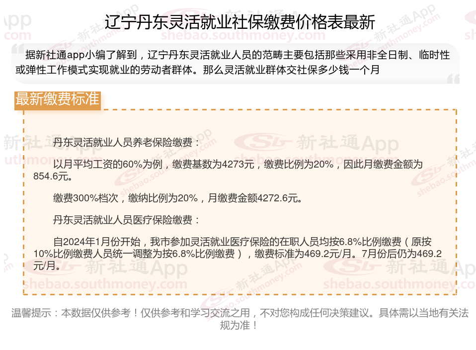 2025灵活就业社保缴费标准的调整,既体现了法规的连续性,又适应了经济社会发展的要求。灵活就业人员应根据自身情况,合理选择缴费基数和缴费比例,确保自身权益得到充分保证。那么2025年辽宁丹东灵活就业人员社保需要交多少钱?下面随新社通小编一起来看看。