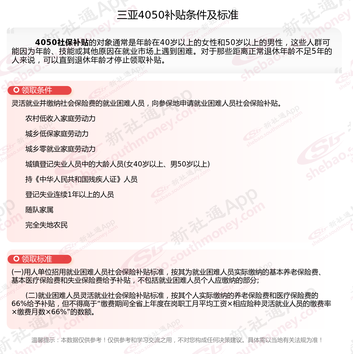 一、2025年三亚4050社保补贴标准及条件是多少?