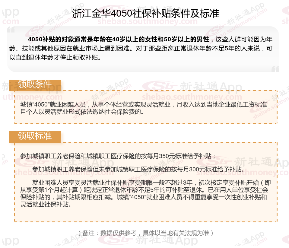 二、2025年浙江金华4050社保补贴标准及条件是什么?