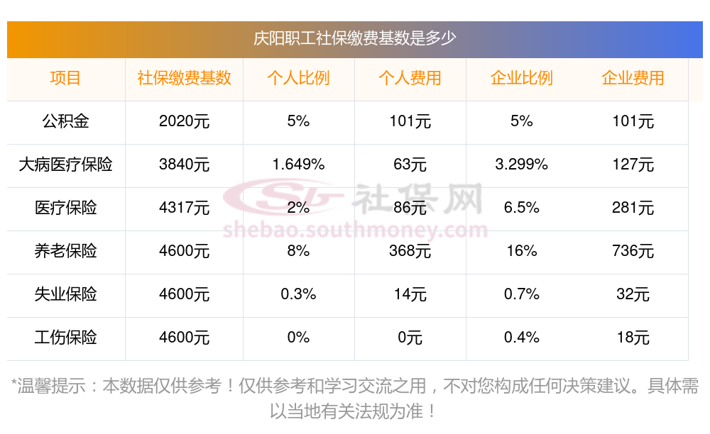 2025年庆阳社保缴费多少钱?下表是2024-2025年庆阳社保费用明细参考,新社通app-社保缴费查询工具提供的最新数据如下: