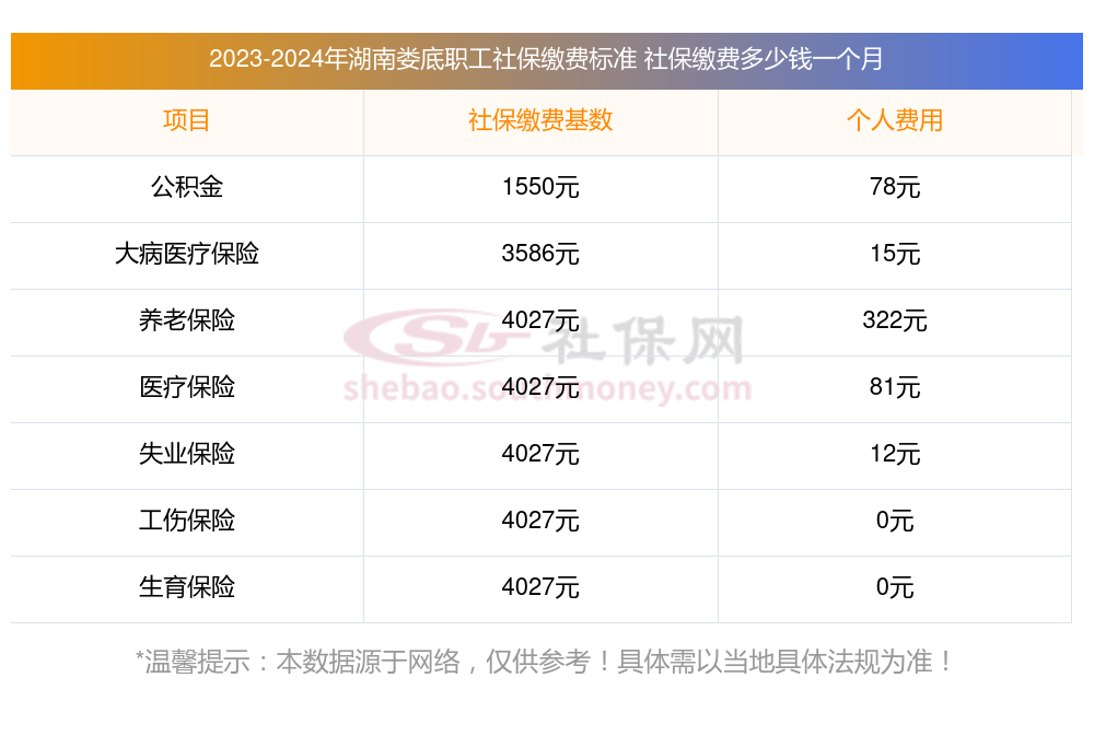 2025年湖南娄底社保缴费多少钱?下表是2024-2025年湖南娄底社保费用明细参考,新社通app-社保缴费查询工具提供的最新数据如下: