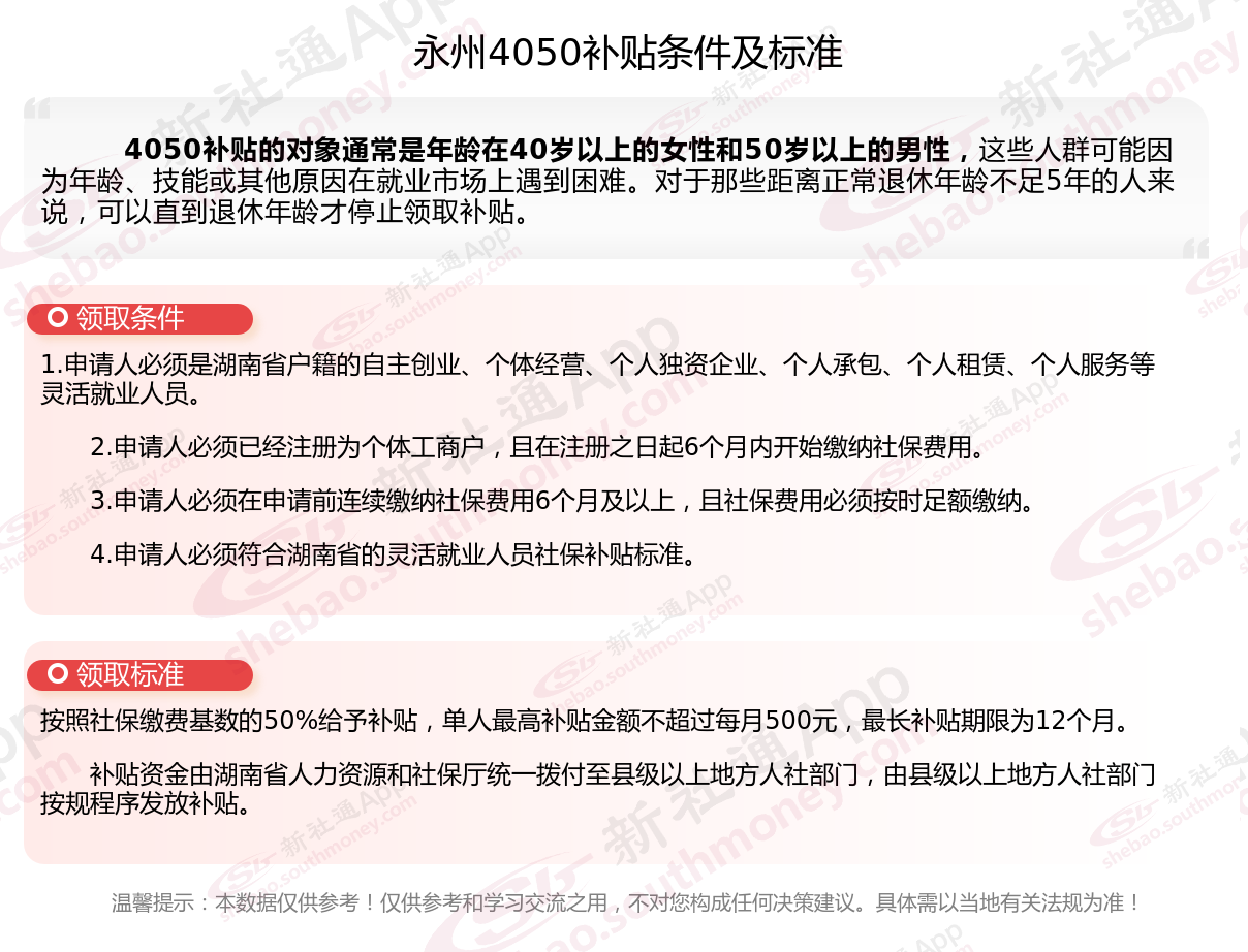 二、2025年永州4050社保补贴标准是多少?领取条件是什么?
