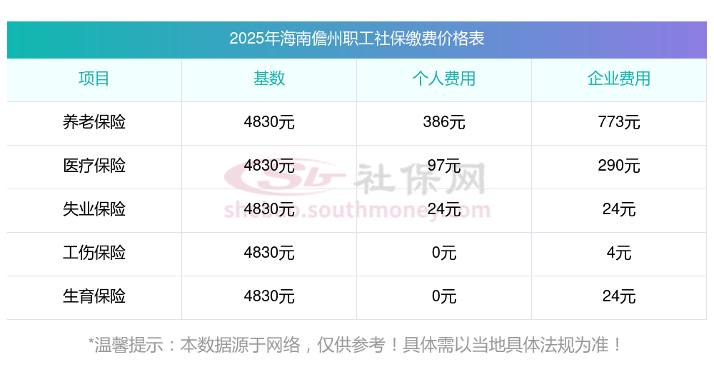 2025年海南儋州社保缴费多少钱?下表是2024-2025年海南儋州社保费用明细参考,新社通app-社保缴费查询工具提供的最新数据如下: