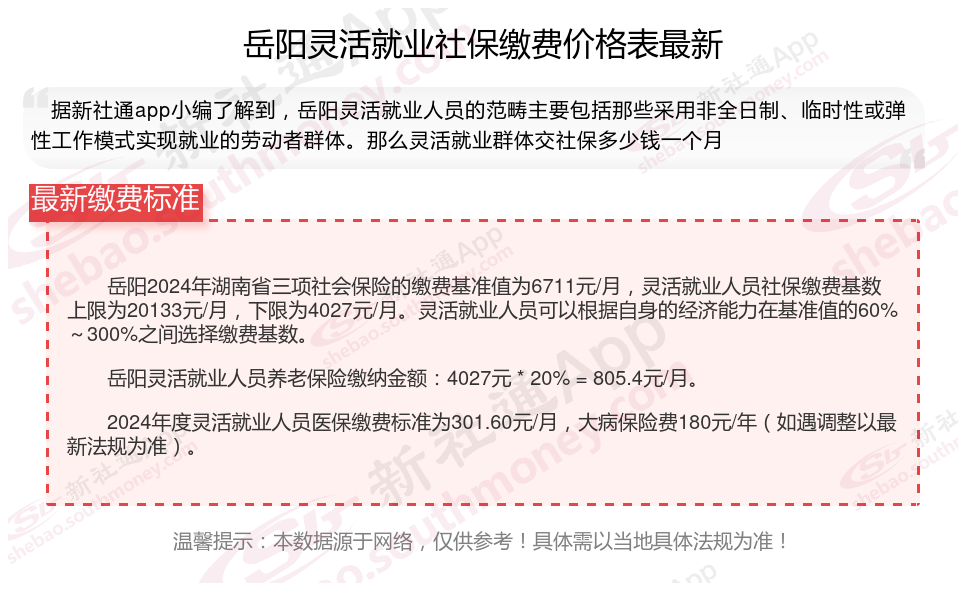 据新社通app数据显示,岳阳灵活就业养老缴费基数明细如下: