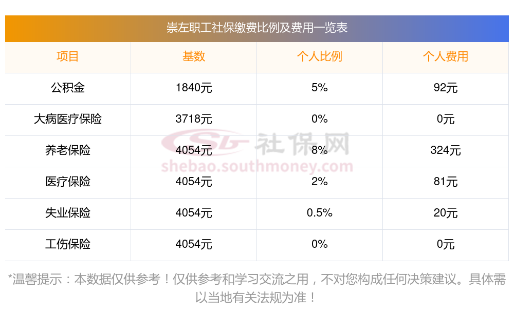 2025年崇左社保缴费多少钱?下表是2024-2025年崇左社保费用明细参考,新社通app-社保缴费查询工具提供的最新数据如下: