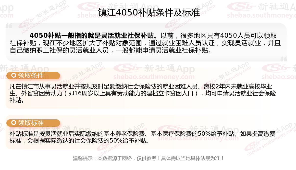 一、2025年镇江4050社保补贴标准及条件是多少?