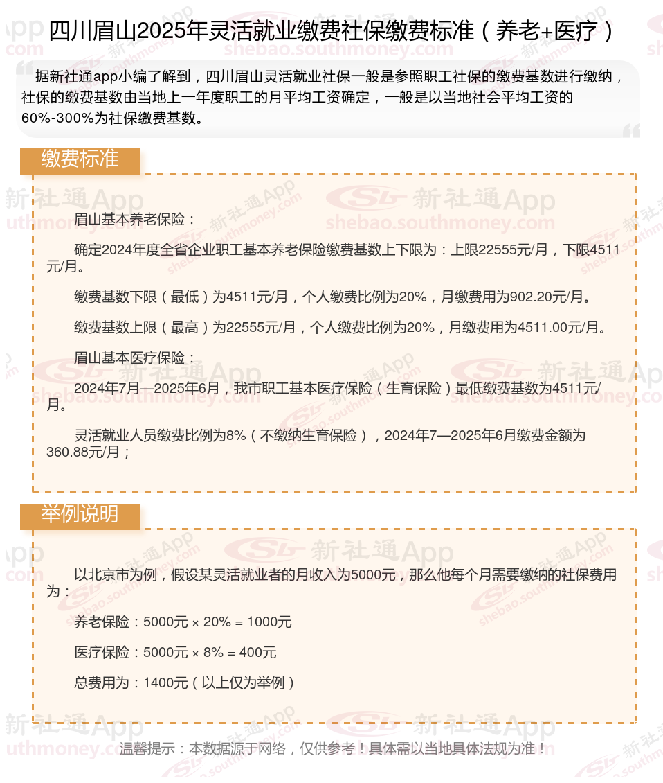 灵活就业人员具备以个人身份参与职工社保的资格,其缴费基数与当地社会平均工资紧密关联,缴费档次在社会平均工资的60%至300%区间内可自由抉择。四川眉山灵活就业人员社保缴费最低标准是多少?下面随新社通小编一起了解灵活就业人员社保详情。