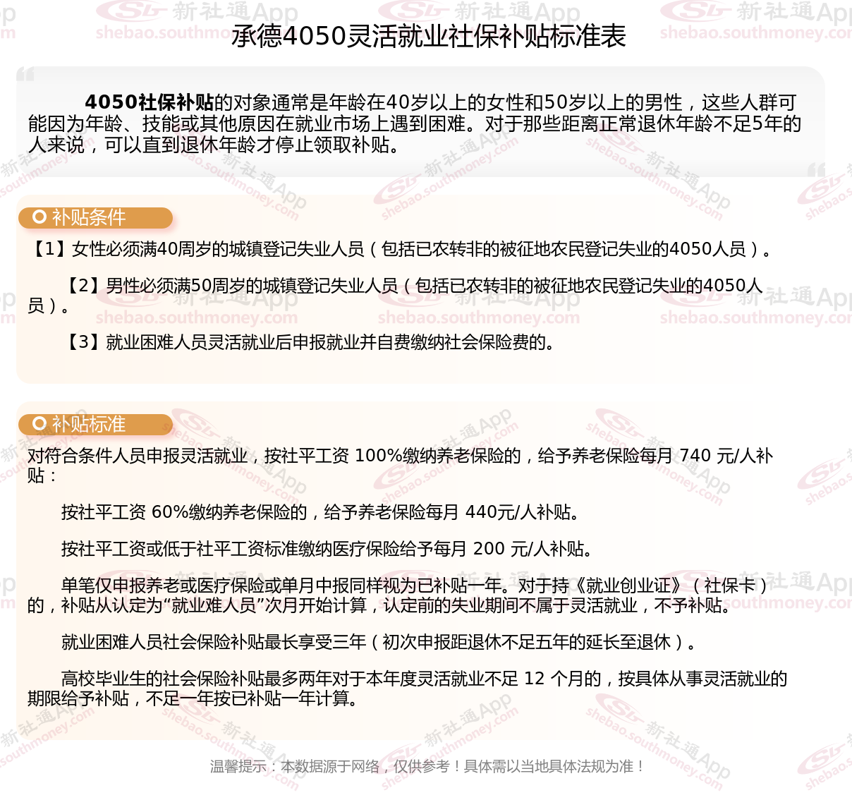 4050补贴主要是针对大龄就业困难人群的社保补贴,申请条件包括年龄、就业困难、灵活就业并自费缴纳社保,需要持有失业登记证,不同地区可能有细微差别,比如农村户口的限制。那么承德4050灵活就业社保补贴标准是多少钱?承德4050社保补贴条件是什么?接下来随新社通APP小编了解一下最新资讯。