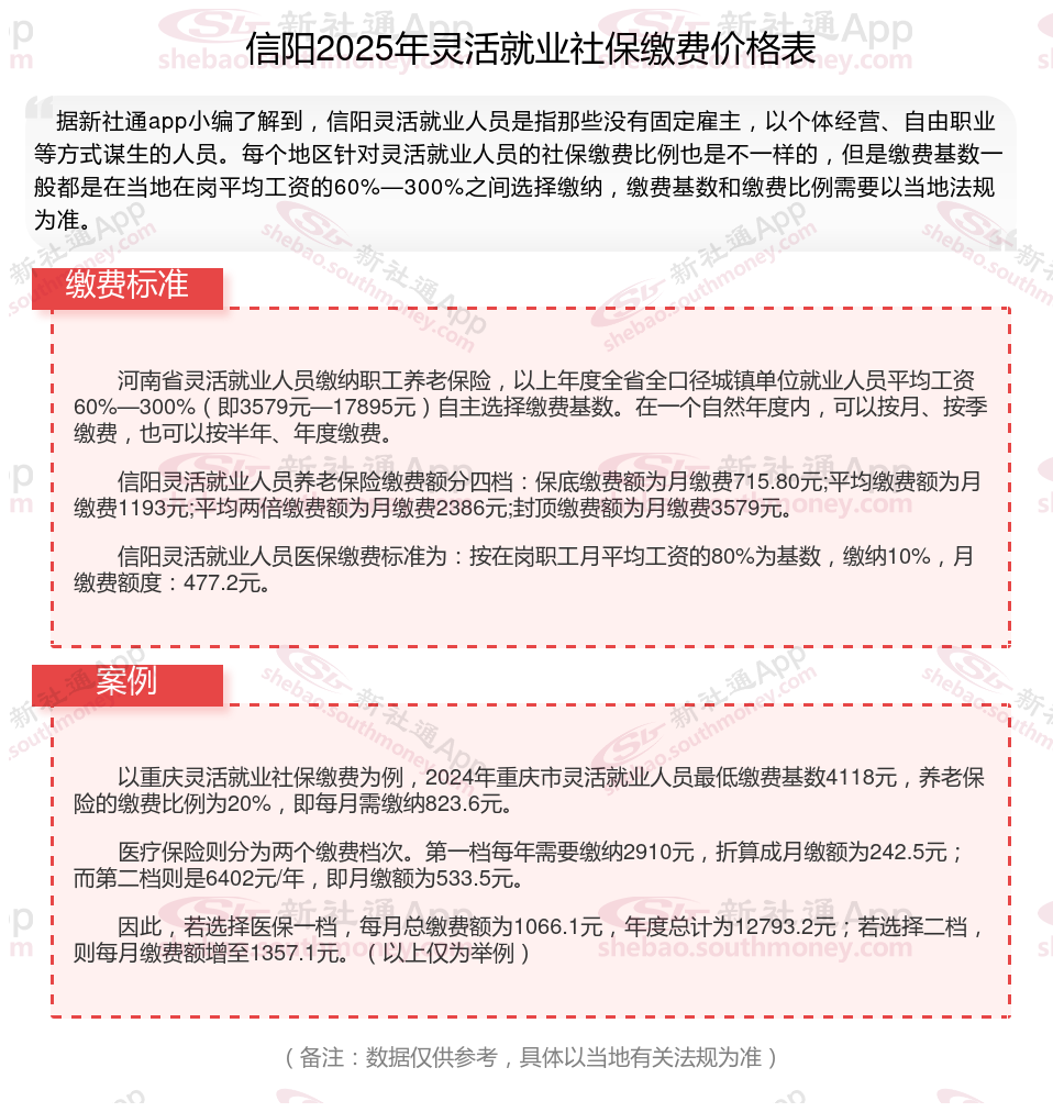 据新社通app数据显示,信阳灵活就业养老保险的缴费基数为:3579元。灵活就业人员参保缴费的比例为个人20%。